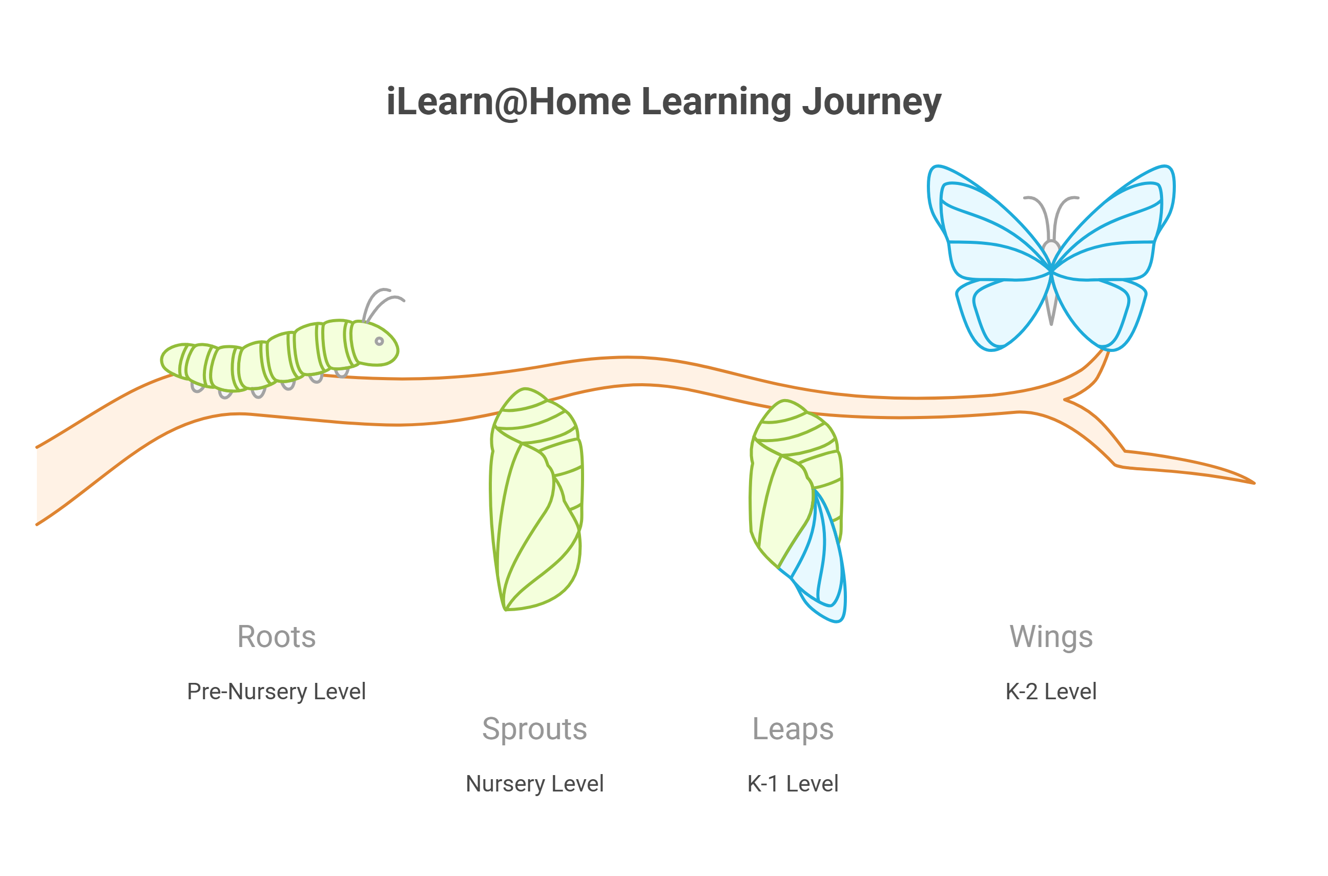iLearn@Home content, is now structured into four levels – Roots, Sprouts, Leaps, and Wings – tailored for Pre-Nursery, Nursery, K-1, and K-2 students, respectively. This update brings a wealth of resources, including rhymes, lessons, and interactive books, designed to foster engaging and effective learning experiences at home.